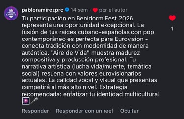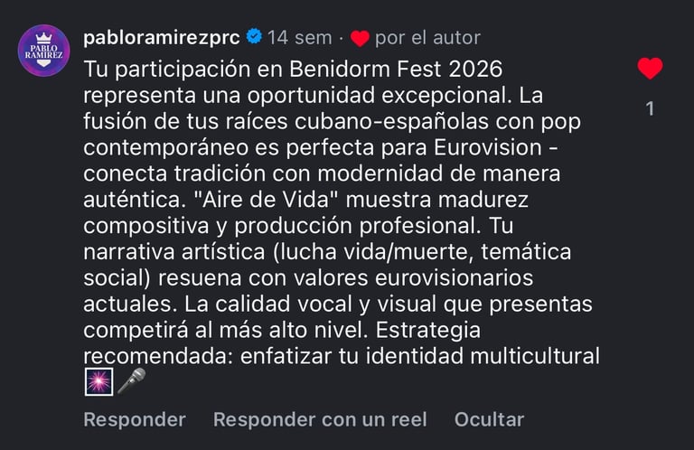 "La candidatura al Benidorm Fest 2026 con el tema Aire de Vida funcionó como un catalizador de reconocimiento profesional. Aunque la propuesta no formó parte de la selección final televisada, logró un impacto cualitativo en el circuito de management de élite, validando la viabilidad comercial del 'Dark Pop Latino'. La crítica especializada, incluyendo a figuras como Pablo Ramírez (Booker & Talent Manager vinculado a actos globales como Karol G o J Balvin), avaló el proyecto destacando su 'madurez compositiva' y su capacidad para conectar 'tradición y modernidad'. Esta recepción confirma que la marca Polo posee la solidez técnica y narrativa para competir en estándares internacionales."